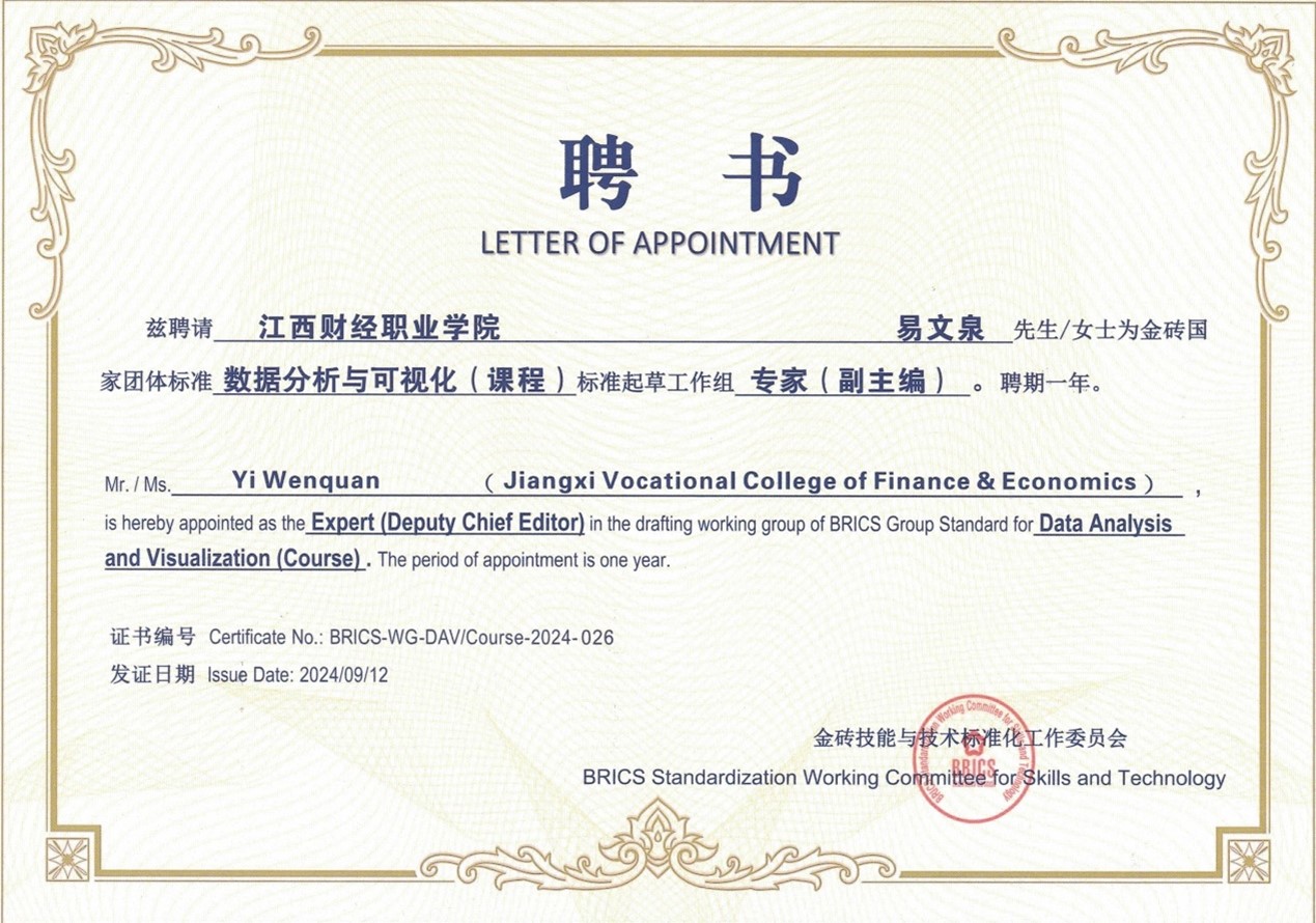 11月8日,一带一路暨金砖国家技能发展国际联盟大数据和人工智能专业委员会组织召开了金砖国家团体标准“数据分析与可视化”的终审会。公司是该国际团体标准的副主编单位,betway西汉姆联经理易文泉是该团体标准的副主编,betway西汉姆联副经理彭健、大数据技术教研室主任王奎及专职教师袁芳是编委。易文泉代表公司上台领取了聘书,会议对金砖国家团体标准“数据分析与可视化”进行了审议,听取了大家的意见和建议,待修改完善后将予以正式发布。通过参编金砖国家团体标准,为公司开展职业教育国际交流与合作,构建国际化课程体系,输出专业标准和课程标准搭建了新的交流平台,探索了职教出海的有效途径。